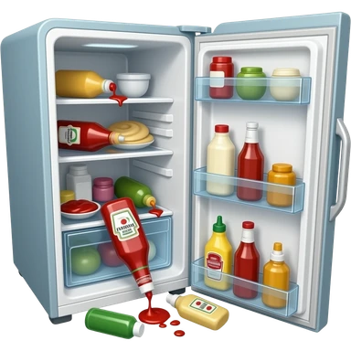GELADEIRA ABERTA BAGUNÇADA COM KECTHUP,MAIONESE, MOSTARDA E OUTROS MOLHOS JOGADOS emoji