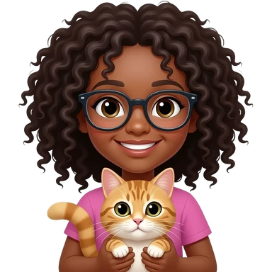 Menina preta com cabelo cacheado e óculos segurando um gato emoji