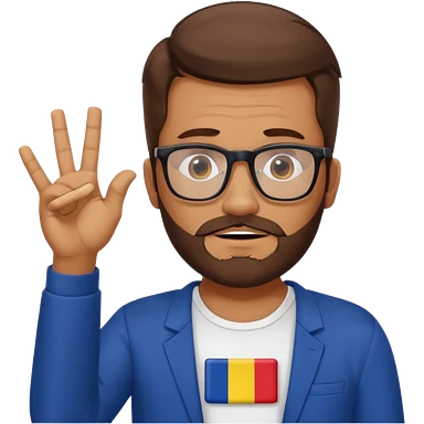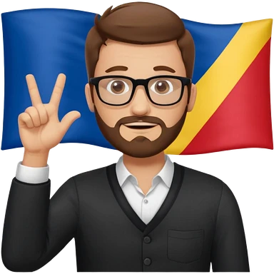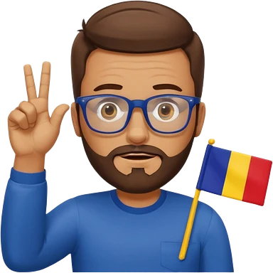 A brown-haired man with a designer stubble beard and rectangle glasses. He shrugs in a "I don't know" gesture, In the background the Romania flag. emoji
