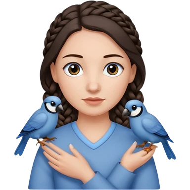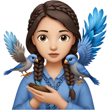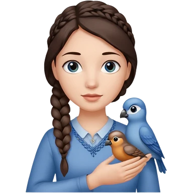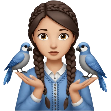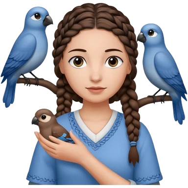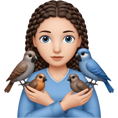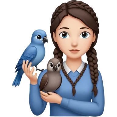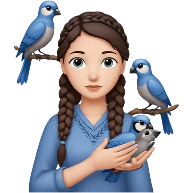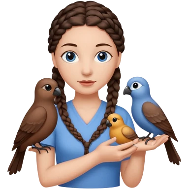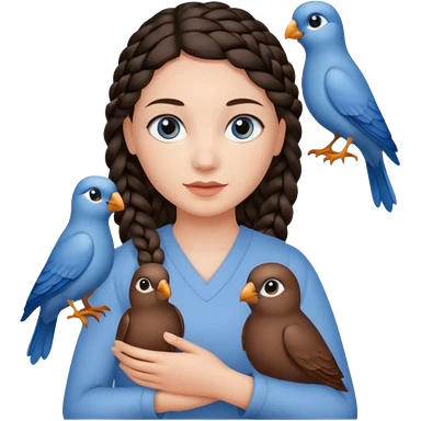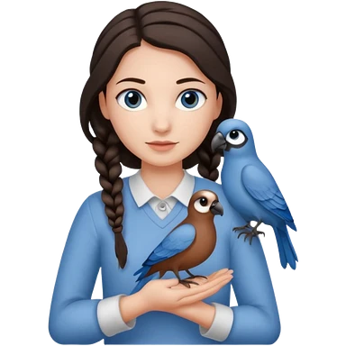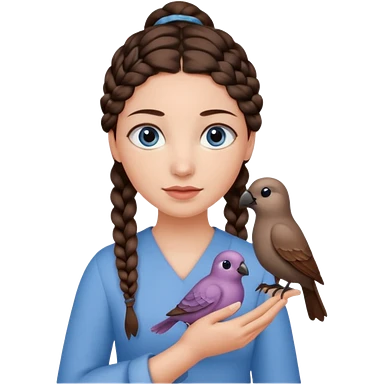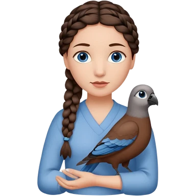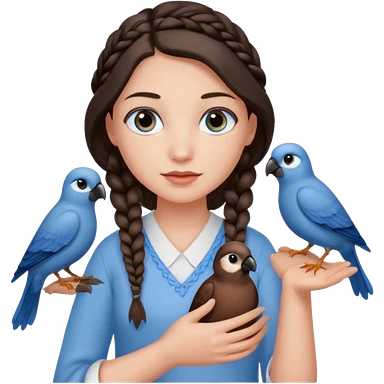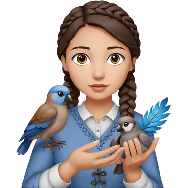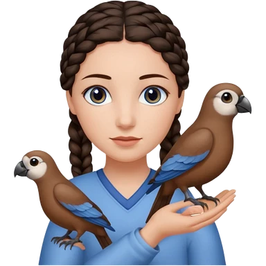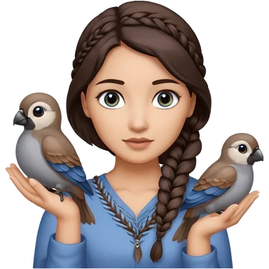 женщина с одной темно-коричневой косой серо-голубыми глазами и светлой кожей держит на руке трех птиц коричневого цвета emoji