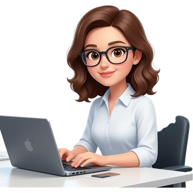 donna con occhiali che lavora al computer, capelli castani ondulati, lunghezza media,occhi castani emoji
