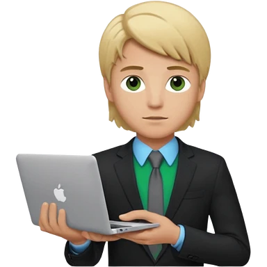 a young boy of about 20 with blond hair that is medium length, he is dressed in suit with tie and jacket, tie blue jacket black, in his hands he has a gray macbook, and black iphone. green-brown eyes emoji