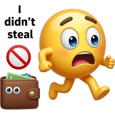 Мемный эмодзи в мультяшном стиле: забавный персонаж с испуганным лицом убегает от кошелька или сумки, прячет руки за спину. У кошелька могут быть «глазки» или лёгкая анимационная подача. Рядом маленький красный запрещающий знак. «я не воровал». emoji