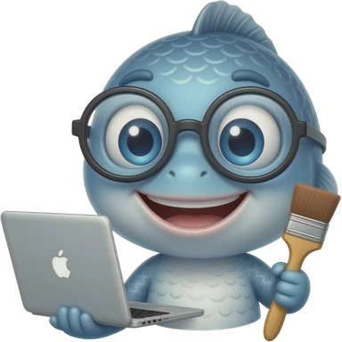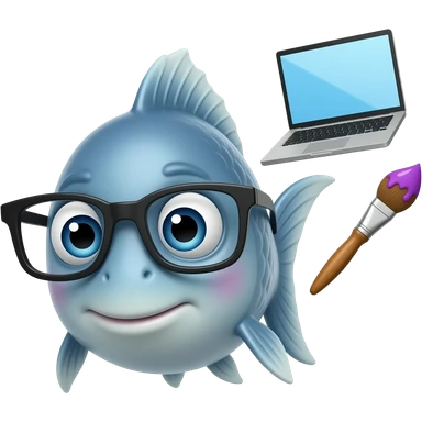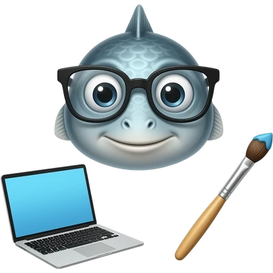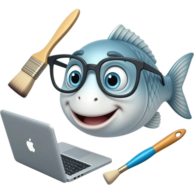노트북과 붓이 있는 안경쓴 물고기 얼굴 몸은 없고 노트북이랑 붓은 허공에 emoji