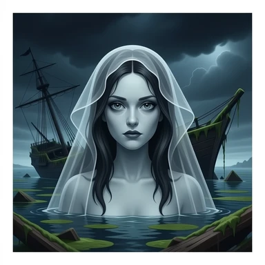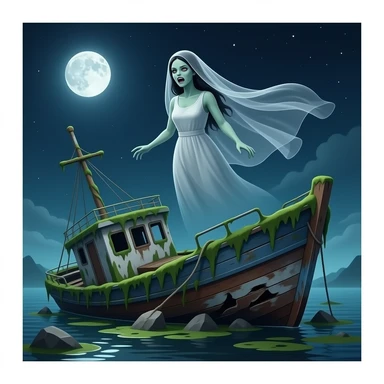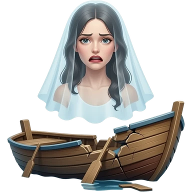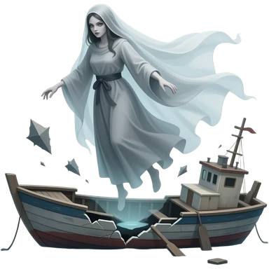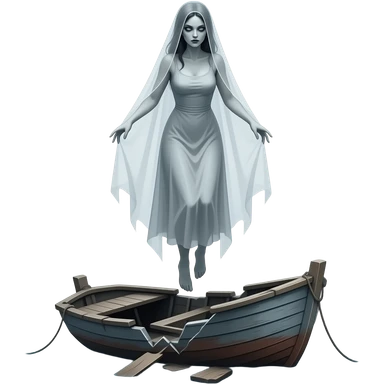 cinematic - a broken boat with a terrifying female apparition around which a transparent veil flutters hovers emoji