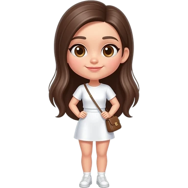 Pretty teenage girl emoji, full body, long hair laid on the back, girly white outfit, carrying a small bag, slim with natural proportions like a real girl, realistic style, confident diva vibe, bright colors, minimal background, not weird lookin emoji