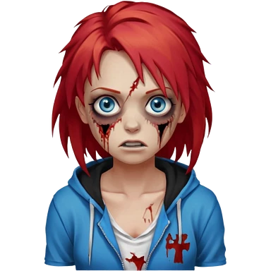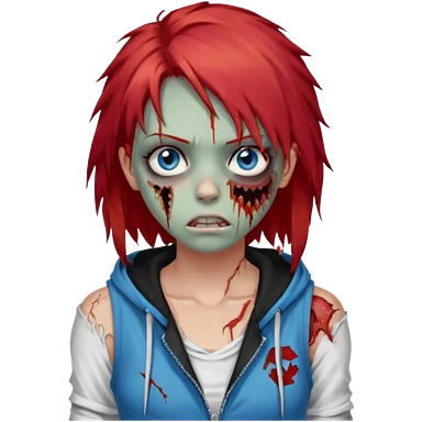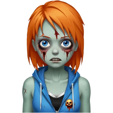 сделай рыжую девушку зомби с избитым лицом, не в полный рост, пусть ее рыжие волосы будут ниже груди с осветленными прядями, глаза у нее будут голубые, а одета она будет в дранную белую майку и черную зип худи emoji