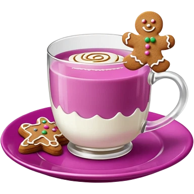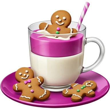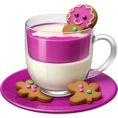 A glass of milk sits on a magenta saucer with gingerbread cookies. emoji