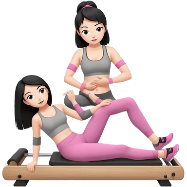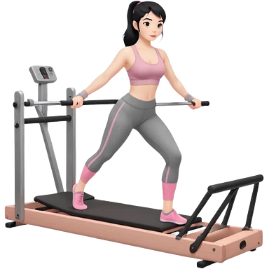 Fair-skinned black hair girl wearing grey workout set in leggings and bra doing pilates on a reformer emoji