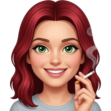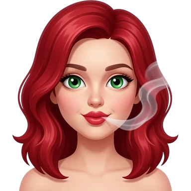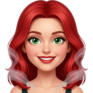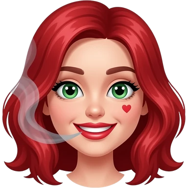 Ruby red haired girl. With smoke. Green eyes. Smiley and flirty. No bangs. Red lips emoji