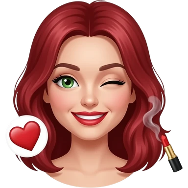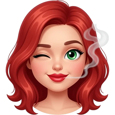 Ruby red haired girl. With smoke. Green eyes. Smiley and flirty. No bangs. Red lips. Heart emoji. Kissing emoji. Winking emoji