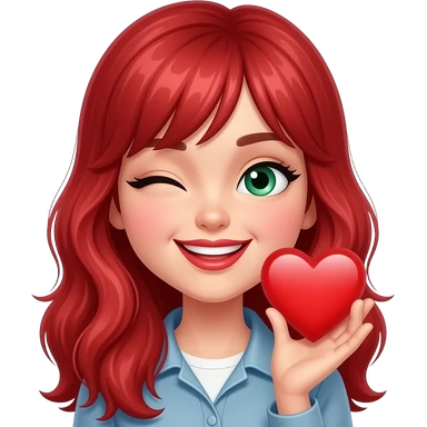 Ruby red haired girl. With smoke. Green eyes. Smiley and flirty. No bangs. Red lips. Heart emoji. Winking. Blowing kisses emoji