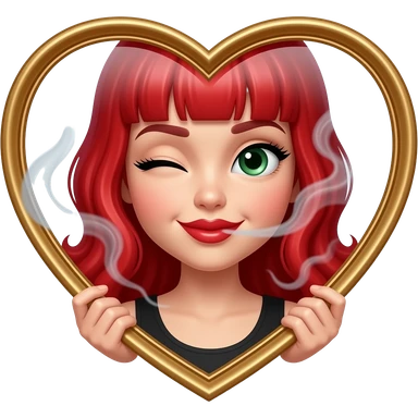 Ruby red haired girl. With smoke. Green eyes. Smiley and flirty. No bangs. Red lips. Heart emoji. Lip emoji. Winking emoji