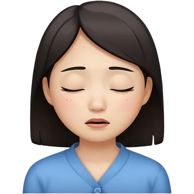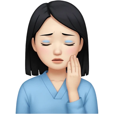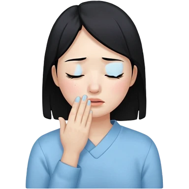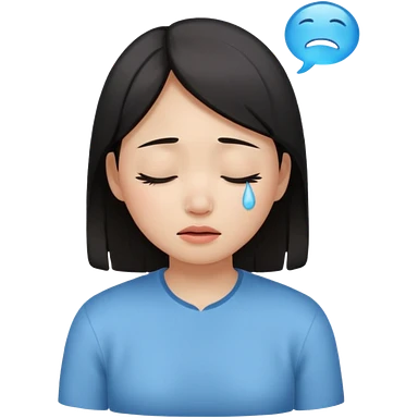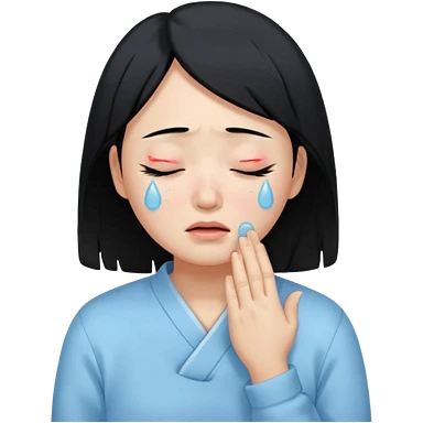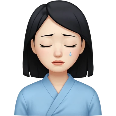 A crying East Asian woman with black hair, wearing light blue clothing. Her skin appears dry, closing her eyes and crying emoji