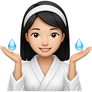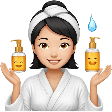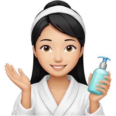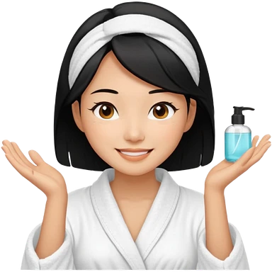 A black-haired East Asian woman smiling with a satisfied, relaxed expression. She is wearing a bathrobe, in the middle of her skincare routine, and her skin looks radiant. emoji