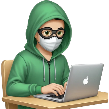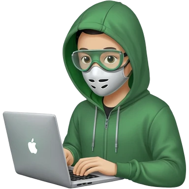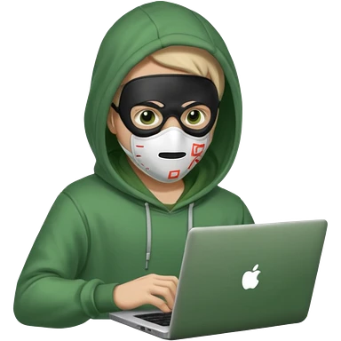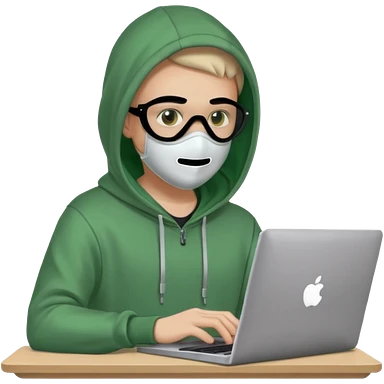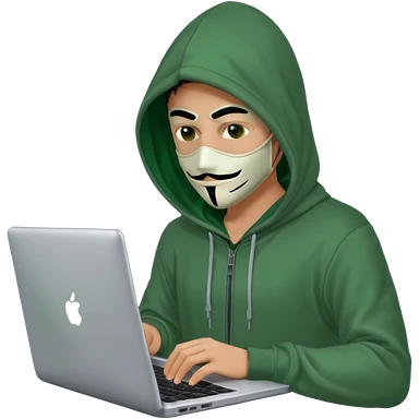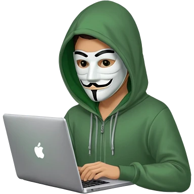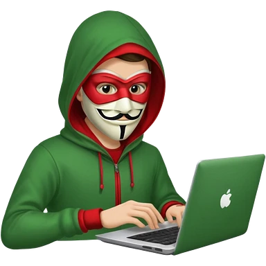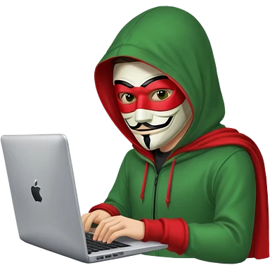 Хакер сидит в зелёно-красной одежде в анонимус маске, печатает в ноутбуке, прозрачный фон. emoji | AI Emoji Generator