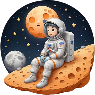 A whimsical digital illustration of a cartoonish astronaut, delicately rendered in soft pastel hues, sitting on a tiny, cratered moon, lost in thought as they stare out into the vast, starry expanse of empty space, their bright orange emoji