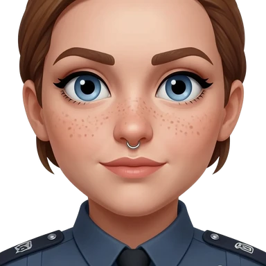femme agent de securité yeux bleu tache de rousseur percing au nez emoji