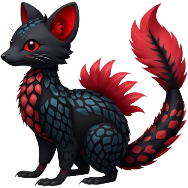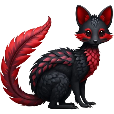 Feral Rare Fantasy shiny soft fuzzy furry vibrant tropical obsidian-black and crimson-red Vernid-Trico-species-creature by LiLaiRa, random markings, tufted tail, tufted ears, full body emoji