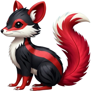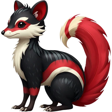 Feral Rare Fantasy shiny soft fuzzy furry vibrant tropical obsidian-black and crimson-red Vernid-Trico-species-creature by LiLaiRa, random markings, tufted tail, tufted ears, full body with markings with white skunk-tail-stripes emoji