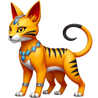 Colorful orange red black yellow Bastet-Gatomon-Vernid-Protogen-Digimon-Fakémon-Pokémon-creature (full body) emoji