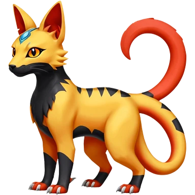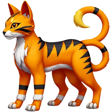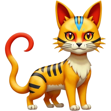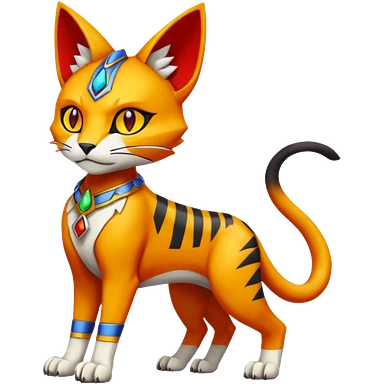 Colorful orange red black yellow Bastet-Gatomon-Meowth-Vernid-Protogen-Digimon-Fakémon-Pokémon-creature (full body) emoji
