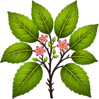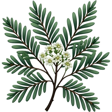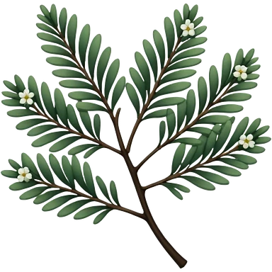 green pine leaves, small flowers, thin ebony branches, dull colored filigree design emoji