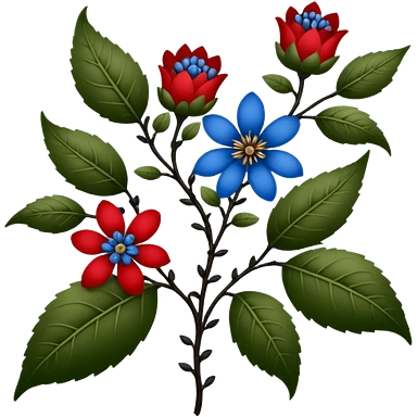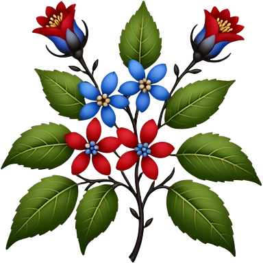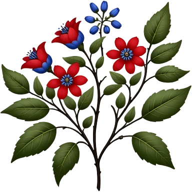 dull green leaves & red & blue flowers filigree design, small fruits, ebony branches, extremely detailed, complex design emoji