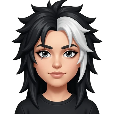 long spiky black hair, heavy eyeliner, white hair highlights, and eyebrow pirecing emoji