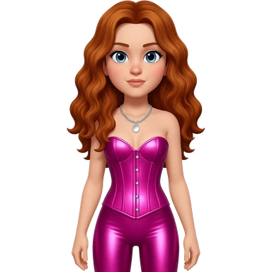 Chappell Roan with blue eyes, long auburn wavy hair, fuchsia metallic corset, fuchsia metallic leggings, silver necklace emoji