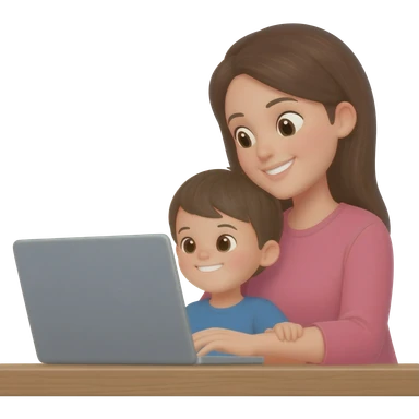 Девушка с ребенком на фото работает онлайн за ноутбуком радостная emoji