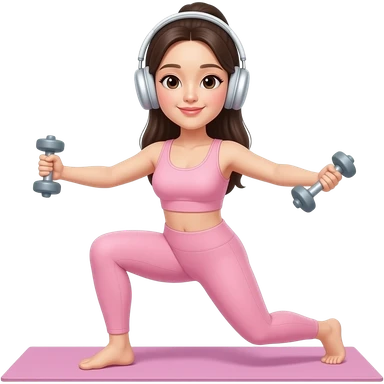 연분홍 요가복을 입은 몸매가 좋은 한국 여자가 에어팟 맥스를 끼고, 헬스를 하고 있다 emoji