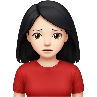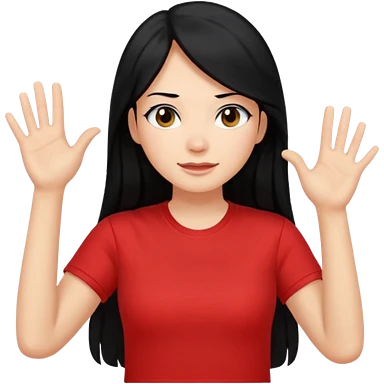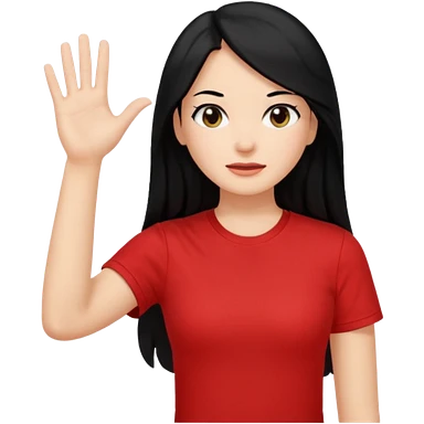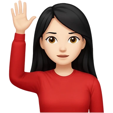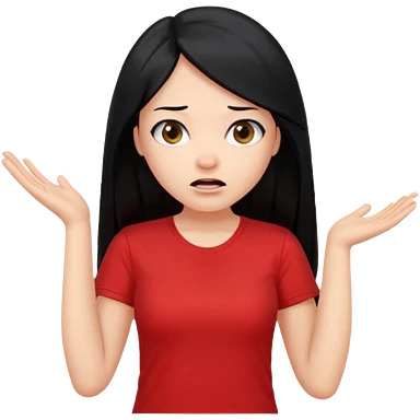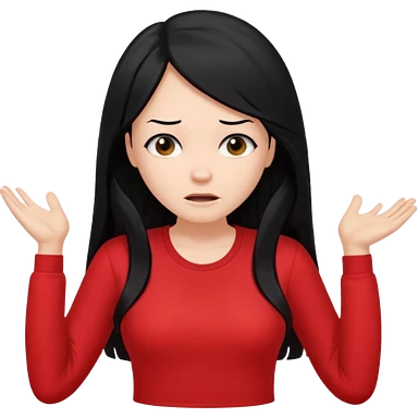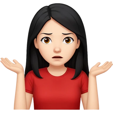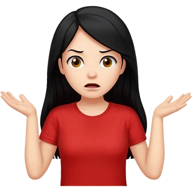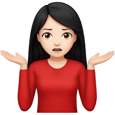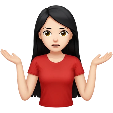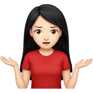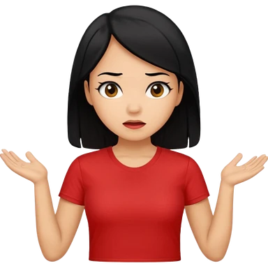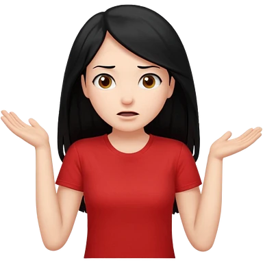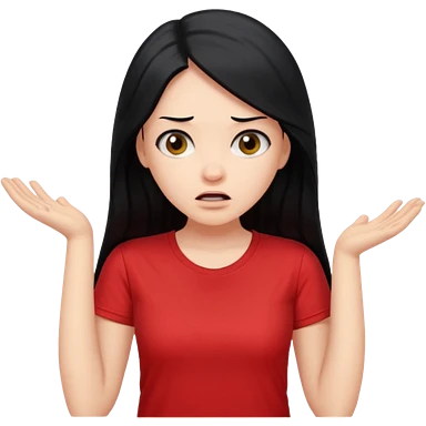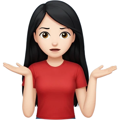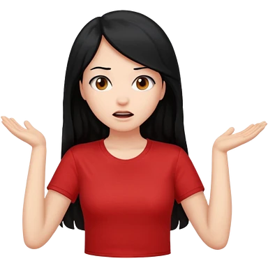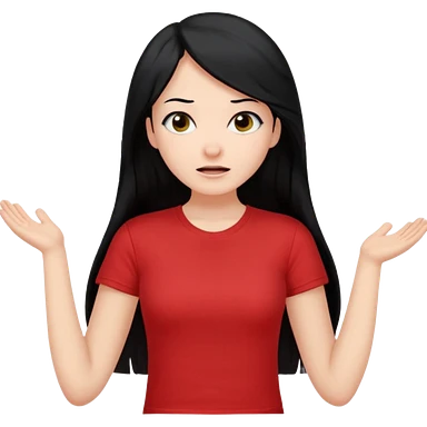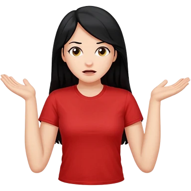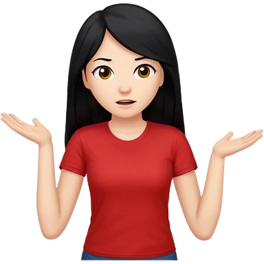 빨간색 티셔츠를 입고 긴 검정머리를 가진 여성이 모르겠다는 듯이 어깨를 올리고 고개를 살짝 왼쪽으로 틀고 왜?라는 제스처를 하고있음 🤷🏻♀️ emoji