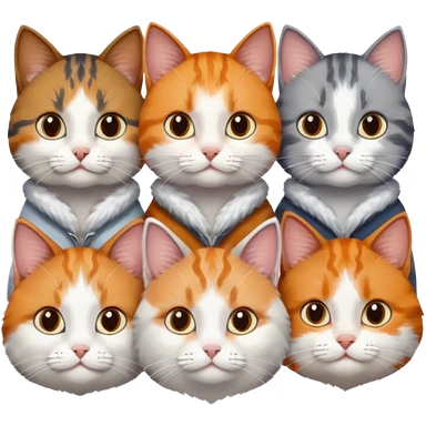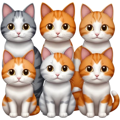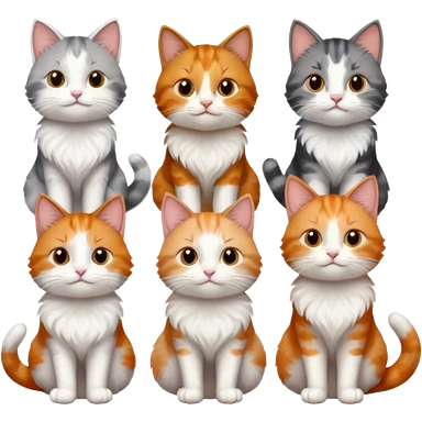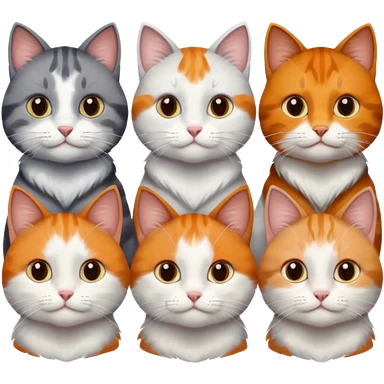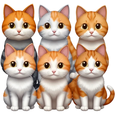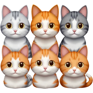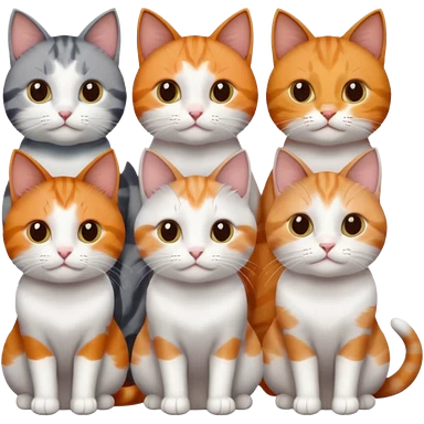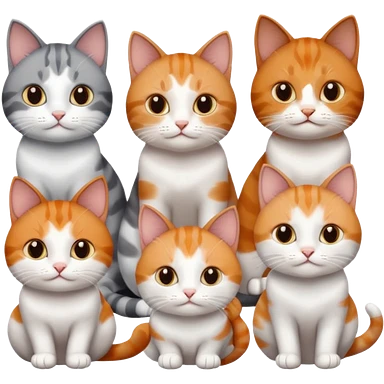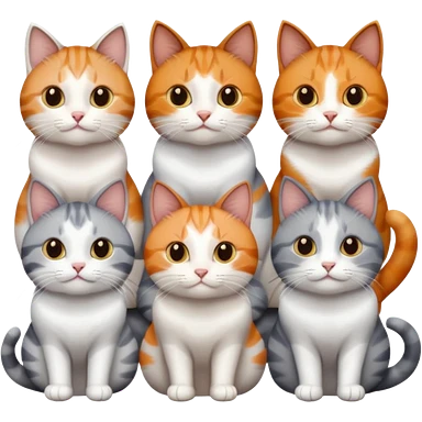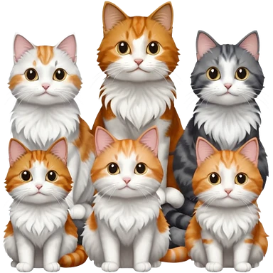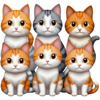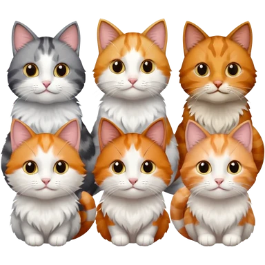6 cats with different coloured coats, 2 are grey and white, 1 is grey with a little white, 1 calico, 1 brown tabby and white and one ginger and white emoji