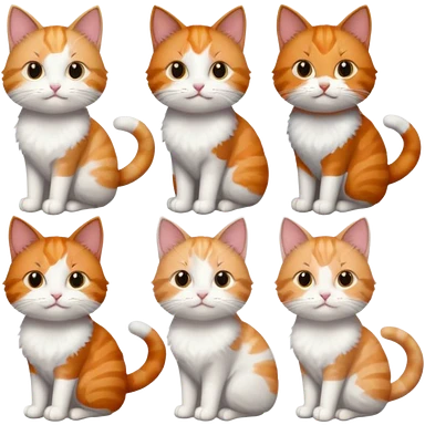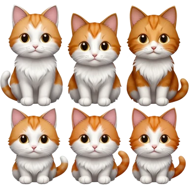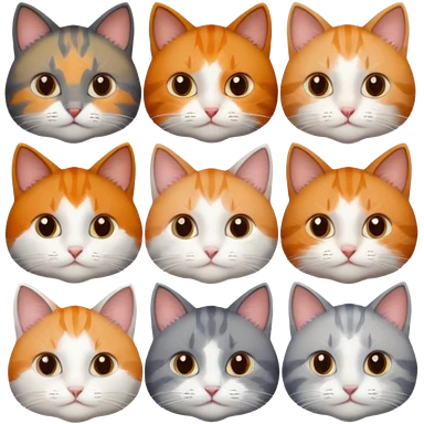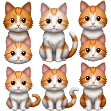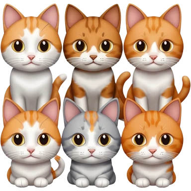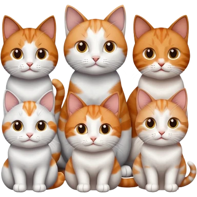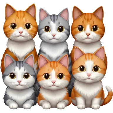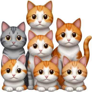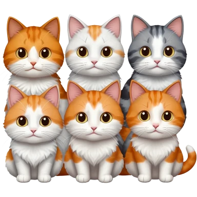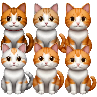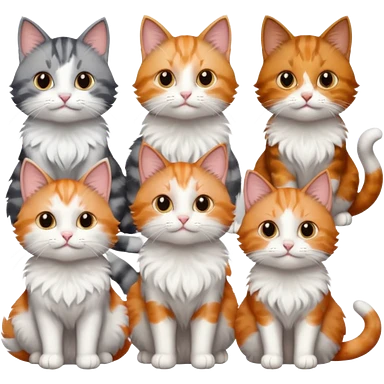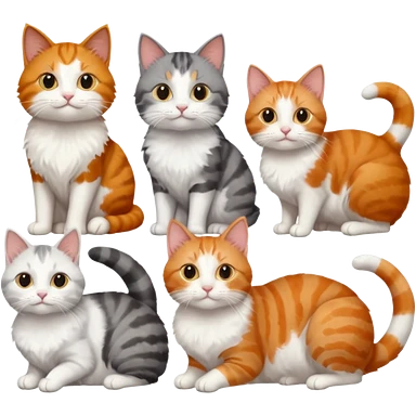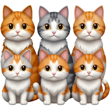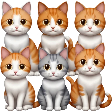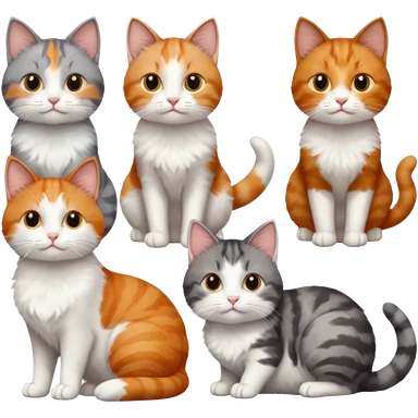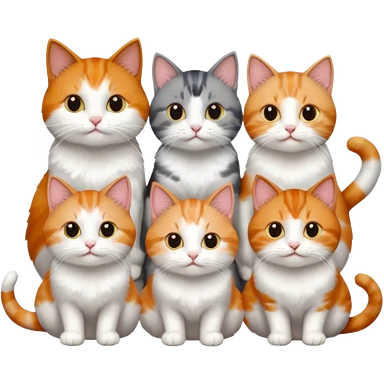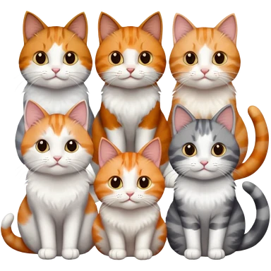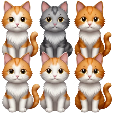 six cats of different colours: 1 small ginger and white, 1 small brown tabby and white, 1 small grey and white, 1 big grey and white, 1 mostly grey with white paws and small white patch on chest and 1 calico emoji