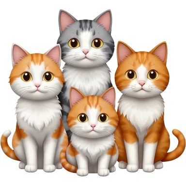 6 cats: 1 small ginger and white, 1 small brown tabby and white, 1 small grey and white, 1 big grey and white, 1 mostly grey with white paws and small white patch on chest and 1 calico emoji