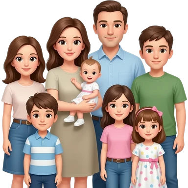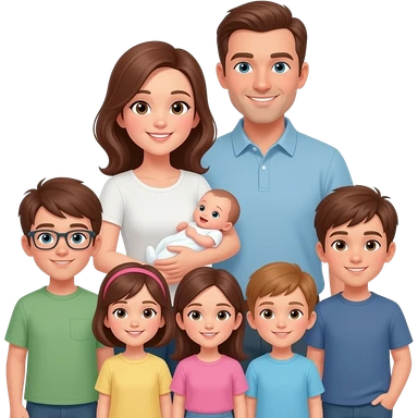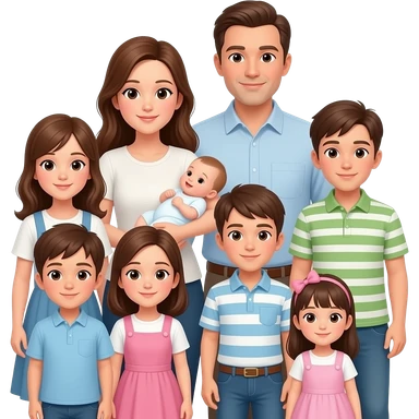 family of 8 white people and all with brown hair with 2 parents mom holding a newborn baby girl and dad with 6 kids in age order- girl-13, boy-10, boy-10, girl-8, girl-1 emoji