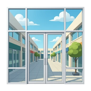 A full square 1 by 1 white and blue stripe building horizontally with brown wooden door on a island with palm trees emoji