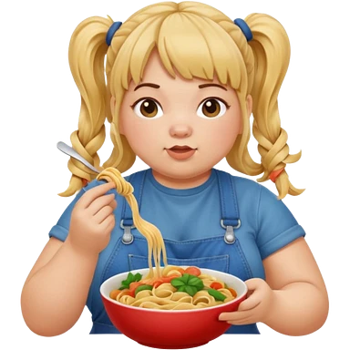 Fat girl with pigtails and bangs in overalls, eating pasta noodles emoji