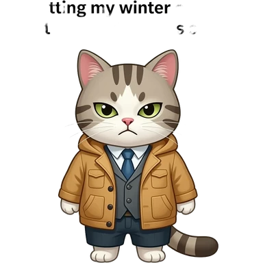 create a anime grumpy cat, like meme stye, the text on top is 'me putting my winter coat away for the 10th time this spring' emoji
