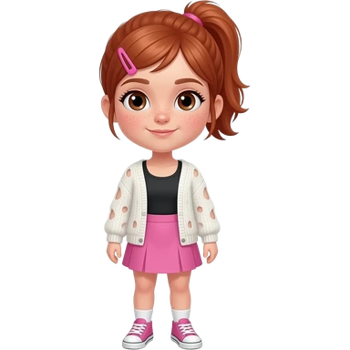 Short. Red hair with pink clip. Brown eyes. White sweater with holes. Black tank top. Pink skirt. Pink shoes. Freckles. Ponytail. 12 years old emoji