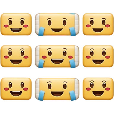 16 different variations of a band aid as and emoji with smiling with teeth, smiling without teeth, crying laughing or sad, mad, sad, tired, censored, funny, glasses, love, serious, with a hat, sticking out tounge, sleeping, injured, and angel Formatted in rows of 4x4 and with a white backgroundemoji