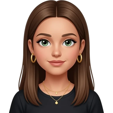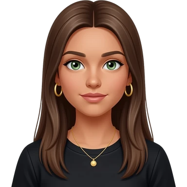 17 year old girl with straight very long brown hair, green-grey eyes, tan skin, gold hoop earrings, dainty gold necklace, wearing a black top emoji