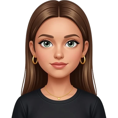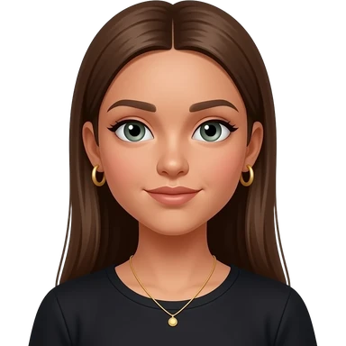17 year old girl with straight extra long brown hair, green-grey eyes, tan skin, gold hoop earrings, dainty gold necklace, wearing a black top emoji