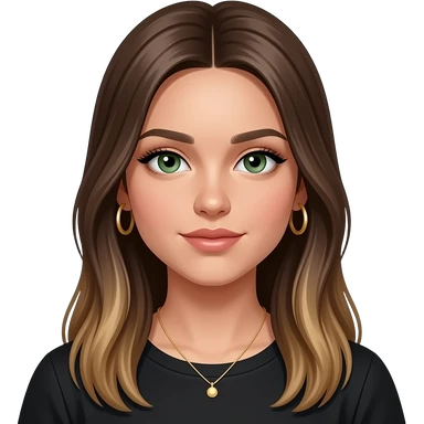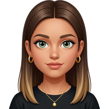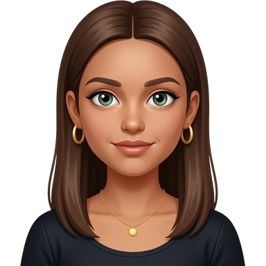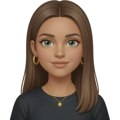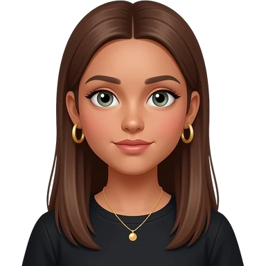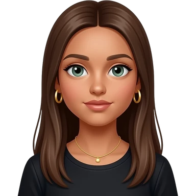 17 year old girl with straight very long medium brown hair, green-grey eyes, tan skin, gold hoop earrings, dainty gold necklace, wearing a black top that covers the collar bones emoji | AI Emoji Generator