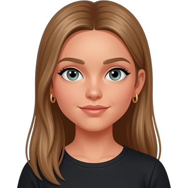 17 year old girl with very long very straight light brown hair, grey-green eyes, tan skin, two sets of small gold hoop earrings on each ear wearing a black top emoji