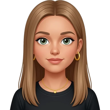 17 year old girl with straight very long medium/light brown hair, green-grey eyes, tan skin, gold hoop earrings, dainty gold necklace, wearing a black top emoji