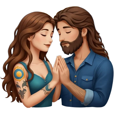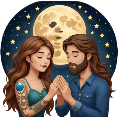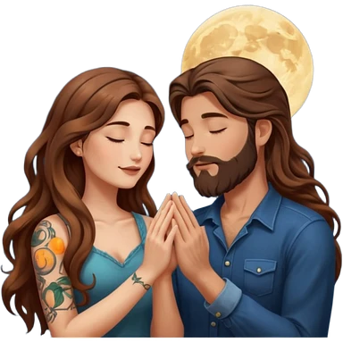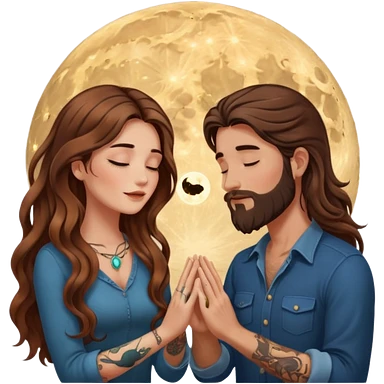 woman with long wavy brown hair tattoos and man with long brown hair beard, foreheads touching, shared glowing moon between hands emoji