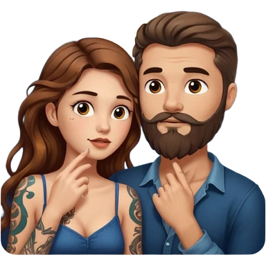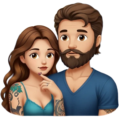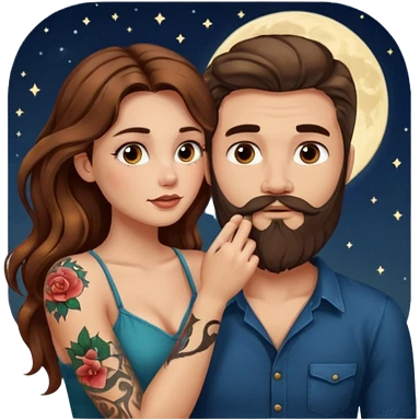 woman with long wavy brown hair tattoos and bearded man, she holds his chin, close flirty stare, moonlight glow emoji