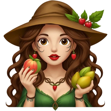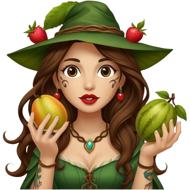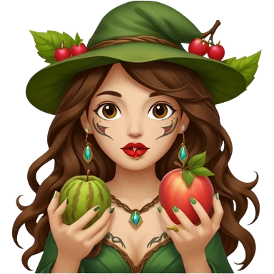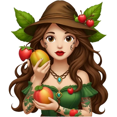 forest mage woman long wavy brown hair tattoos holding fruit near lips emoji